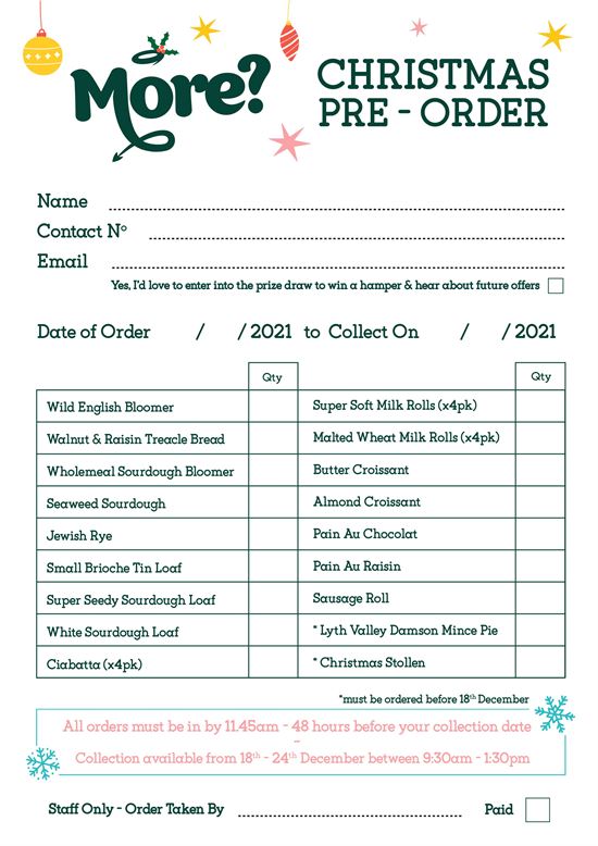 We’ve now launched our More? Christmas pre-order service, which means you don’t have to worry about missing out on our award-winning mince pies, signature sourdough loaves, melt-in-the-mouth sausage rolls and delicious croissants and patisserie range.
